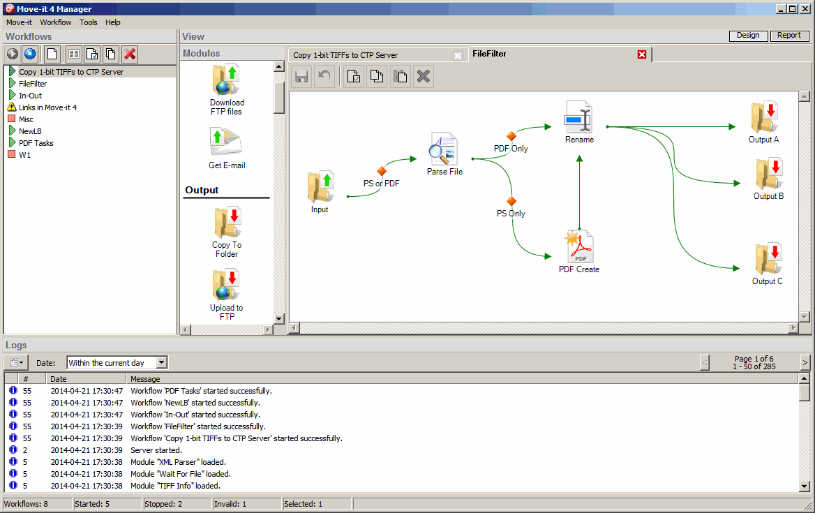 Move-it now incorporates an intelligent, self-regulating mechanism which regularly checks the validity of all its workflows and makes adjustments when necessary. So for example, if all output folders in a workflow are unavailable because of network issues, the workflow is temporarily disabled. This avoids an unnecessary accumulation of files in the error folder as well as error messages. Instead, when files can be safely transferred to their output folders, the workflow is automatically re-enabled.